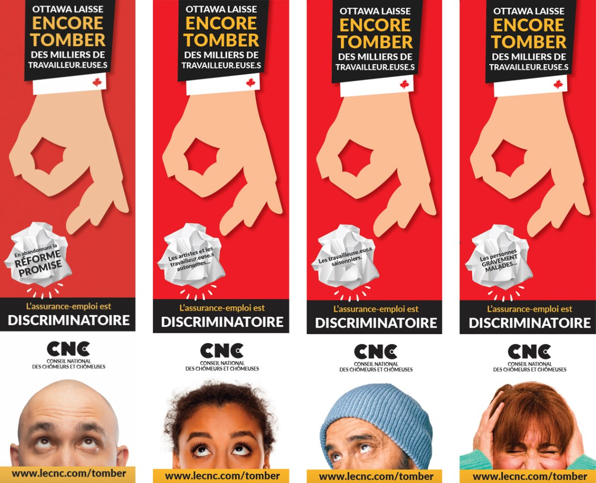 e Conseil national des chômeurs et chômeuses (CNC) lance une campagne sous le thème « Ottawa laisse encore tomber des milliers de travailleur-euse-s ». Dans une série de publicités, le CNC dénonce l’abandon par le gouvernement fédéral de son engagement de réformer l’assurance-emploi et les graves conséquences de cette décision sur le monde du travail, notamment les travailleur-euse-s saisonniers, les travailleur-euse-s autonomes et les artistes et les personnes gravement malades.